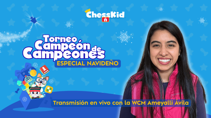 Para celebrar el estas épocas navideñas en ChessKid Español presenta la edición especial del Torneo Campeón de Campeones, para que niños y niñas celebren estas festividades con estrategia, diversión y muchas ganas de superarse. El torneo se realizará el sábado 27 de diciembre y será a 5 rondas, a un ritmo de juego de 5 minutos más 5 segundos de incremento.