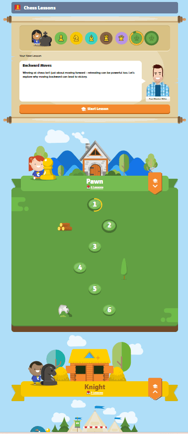 We’ve given our Lessons a new look to make learning chess easier, more fun, and more engaging. The new design is easier to follow so kids can see where they are and what’s next.
