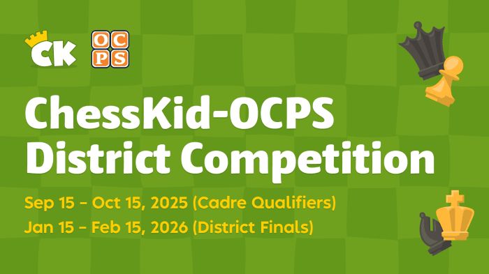 Watch the quick welcome video below from OCPS District Coordinator Nancy Golden to see why your school won’t want to miss the ChessKid OCPS District Competition. Secure your spot before the September 10th sign up deadline!