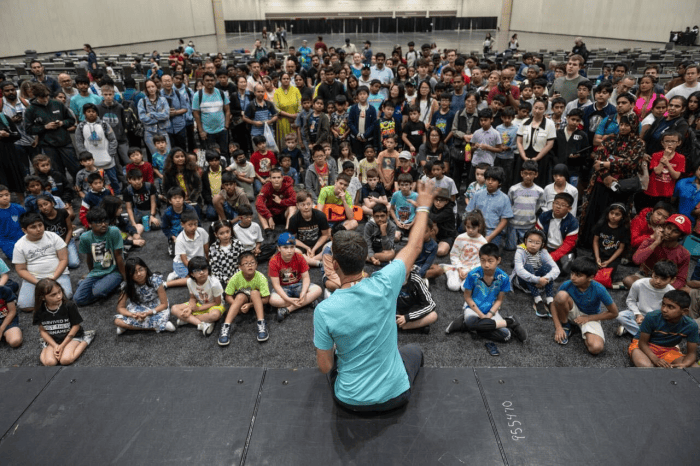 Puzzle championship participants listen as FunMasterMike explains the rules