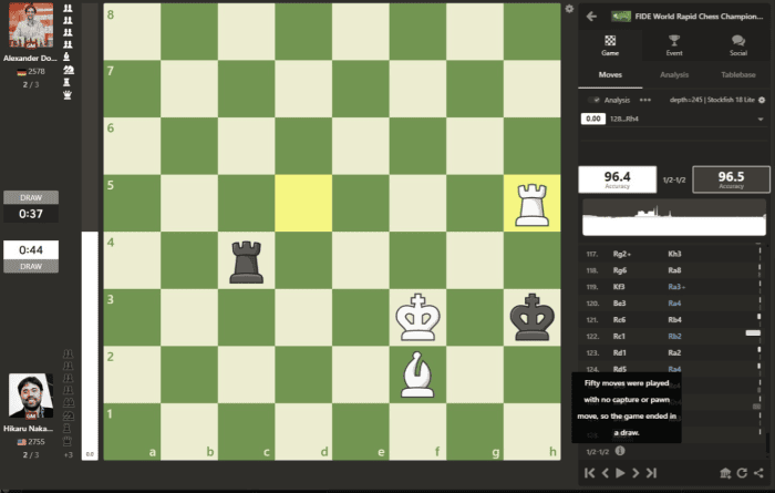The game stretched on for many moves without real progress. At the time, players had to claim a draw themselves, and the 50-move rule played an important role in preventing such games from continuing indefinitely. Although the draw was eventually agreed, this game became a classic illustration of how long endgames can be and why the 50-move rule is necessary.
